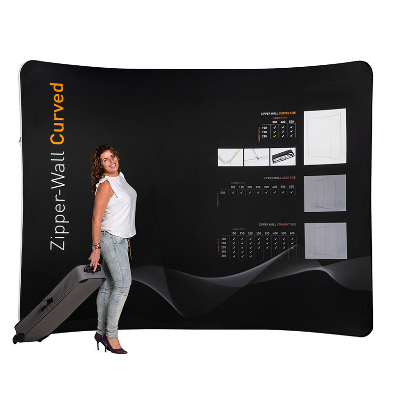Le Zipper Wall galbé est la solution idéale, pour promouvoir un produit, une marque ou une entreprise. Son impression de haute qualité apporte une bonne visibilité de votre visuel. Idéal pour les expositions intérieures, salons, congrès, foires. La toile tendue sur cadre est facile à installer.