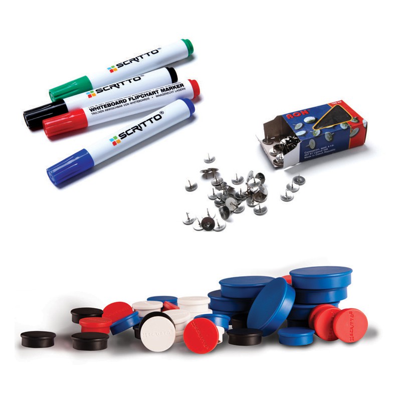 Kit Marqueur pour tableau blanc Set comprenant 4 marqueurs, 16 aimants bleu et blanc, 1 effaceur et 1 flacon de nettoyage. 29,00 € HT soit 34,80 € TTC
