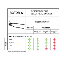 Le piètement avec rotor de 17 mm est compatible avec l'ensemble des Beach flag Budget avec une toile Drop ou Wind.