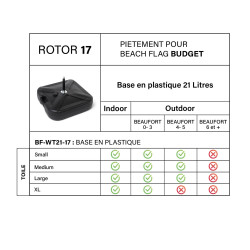 Vous souhaitez installer un Beach Flag à l'extérieur avec une base en plastique ? Veuillez vous reporter au tableau ci-contre pour voir les combinaisons possible en fonctions de vos contraintes environnementales.