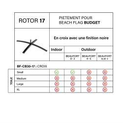 Piètement en croix pour Beach Flag Budget fait partie des best sellers. Piètement léger et discret, il est principalement utilisé en intérieur et il peut être accompagné par des sac de sable ou sac d'eau en option, pour apporter une meilleure stabilité de l'ensemble.Le piètement avec rotor de 17 mm est compatible avec l'ensemble des Beach flag Budget avec une toile Drop ou Wind.