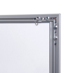 Le cadres est réalisé en aluminium avec une anodisation incolore. Profil 37 x 23 mm. La face arrière en plastique rigide à une finition blanche. Une pince en partie haute permet de maintenir facilement l'affiche.