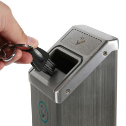Cendrier mural rectangulaire. Système de verrouillage empêchant tout utilisation abusive. Bonne résistance aux intempéries. Discret et élégant.