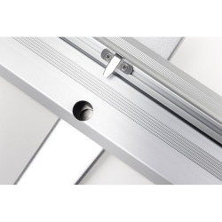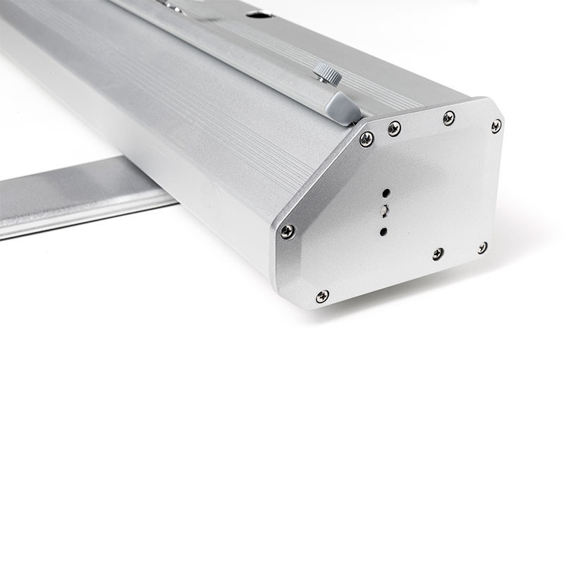 Le Roll-Up bannière XL simple avec une impression simple face est constitué d’un cadre moderne et compact en aluminium avec une anodisation incolore. Ces 2 extrémités sont en aluminium anodisé. 2 larges piètements pivotant permettent de bien stabiliser le Roll-Up bannière au sol.