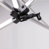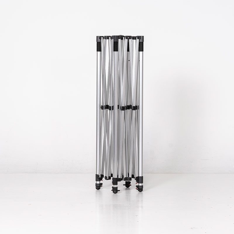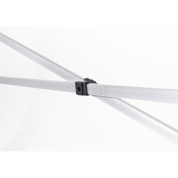 La tente publicitaire appelée aussi gazébo, est fabriquée en profil aluminium avec une anodisation incolore. Les 4 poteaux ont une forme hexagonale de 40 mm pour une meilleure résistance. Les pieds ont une forme arrondie (brevetés) pour faciliter son déplacement dans l'herbe ou sur du bitume par exemple. En partie haute une manivelle permet de tendre votre toile supérieure (canopy).