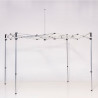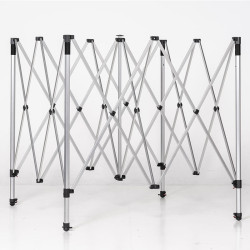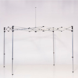 La tente publicitaire appelée aussi gazébo, est fabriquée en profil aluminium avec une anodisation incolore. Les 4 poteaux ont une forme hexagonale de 40 mm pour une meilleure résistance. Les pieds ont une forme arrondie (brevetés) pour faciliter son déplacement dans l'herbe ou sur du bitume par exemple. En partie haute une manivelle permet de tendre votre toile supérieure (canopy).
